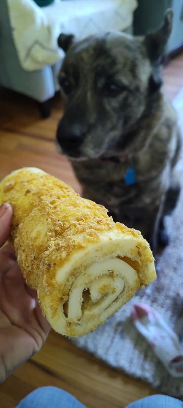 My first impression when opening the package was, "Wow! These are pretty big!" They actually look pretty tasty with the bully dust on them. The package had fun labeling and came with four good sized chews. I was hesitant in trying these since I have only ever given Benny elk antlers but was pleasantly pleased after he got to working on the cheek roll. He especially loved the bully dust because every time it fell off he would lick it all up before chewing again. At first I thought he would have a bit a trouble grasping it to chew but once he wrangled it he was all happy and chewed away. As far as I could see no large bits had come off for choking and it didn't sound like he was breaking his teeth. All good things. I do have to reroute his attention to go outside or another toy after awhile because he can come quite obsessed with it. I would definitely buy these again but think they will last him awhile as long as they are given sporadically for a short time frame. While I was glad he was enjoying these flavorful chews I personally would never give him a chewable of any kind without supervision.