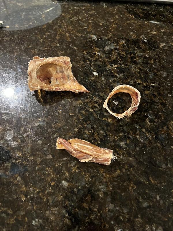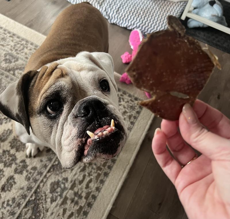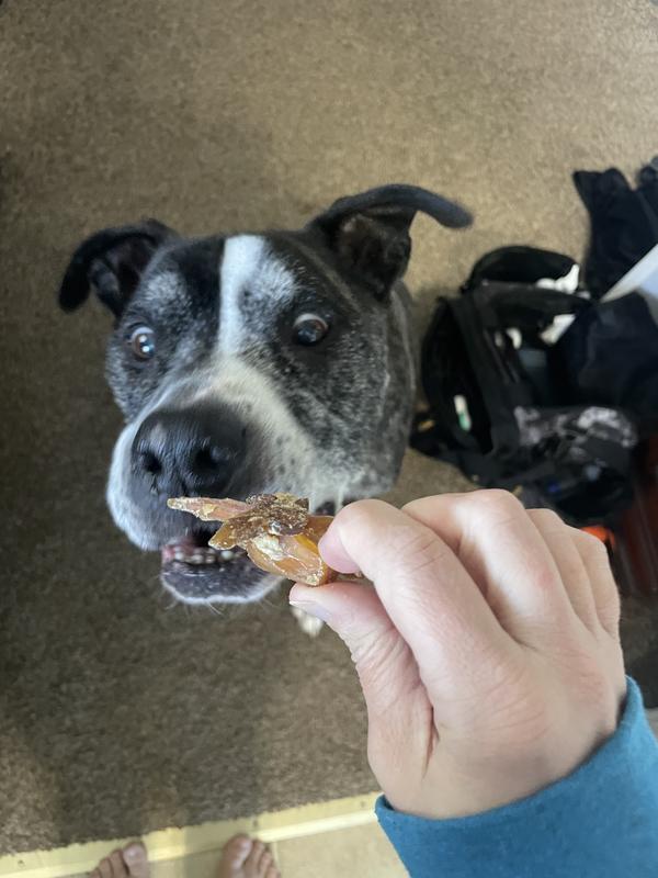 My pitbull pup absolutely loved this treat, and devoured it in no time. It definitely wasn't an engaging treat for her powerful jaws, but that doesn't matter to her! My only concern is how sharp some of the treats are, though I might just be out of touch after not giving my pups rawhide or rawhide-like chews for years. These seem like they'd be a nice alternative!