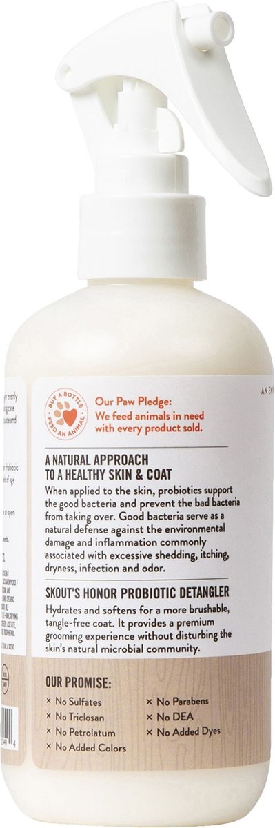 Shake well. Apply detangler evenly from the back of the ears to the tail, taking care to avoid the eyes. FOR MATTING: Saturate and let sit 2-3 minutes. Brush or comb out thoroughly. Repeat as necessary. FOR BEST RESULTS: Use with Skout’s Honor Probiotic Shampoo and Conditioner. Safe for pets 8 weeks of age or older.Store in a cool, dry place. Offer empty container for recycling.