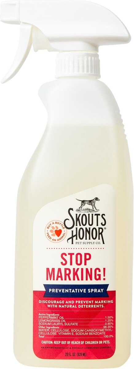 Skout’s Honor Stop Marking! Preventative Spray helps dog parents break the cycle of unwanted marking with the help of peppermint and lemongrass. It creates a scent barrier that discourages dogs from returning to their favorite marking spots.