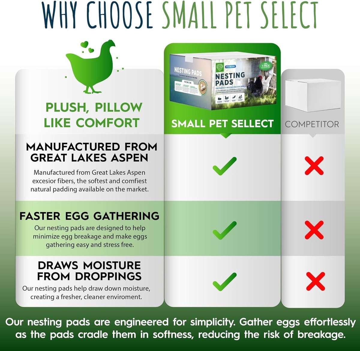 At Small Pet Select, we source quality materials and hand-pack every nesting pad with care, because we believe every flock deserves a cozy, clean nest. From our family farms to your coop, we’re committed to comfort, sustainability, and poultry wellbeing.