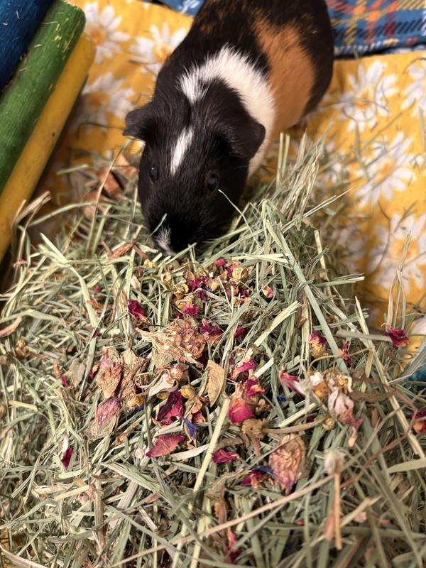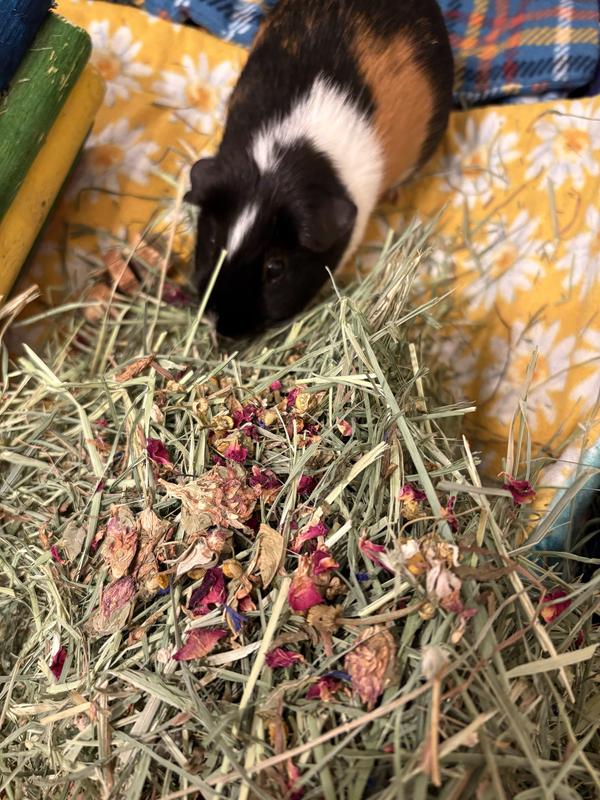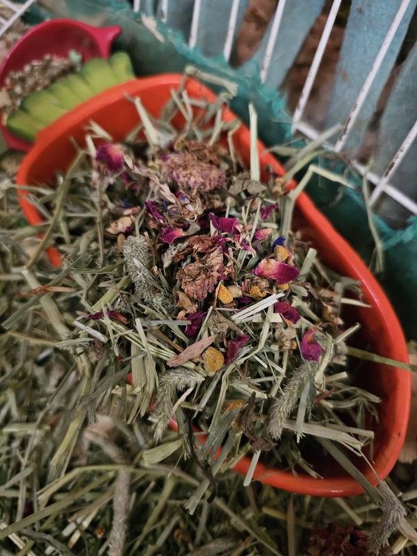 This dried flowers and herbs mix smells amazing and my girls love it. I sprinkled it on their food and also in their hay box. My only disappointment was the small amount in the bag. It's just for a treat, but I still think bigger bag options would be great