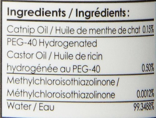 The ingredients are Catnip Oil 0.15%, Peg-40 Hydrogenated Castor Oil 0.50%, Methylchloroisothiazolinone 0.0012%, and Water 99.3488.