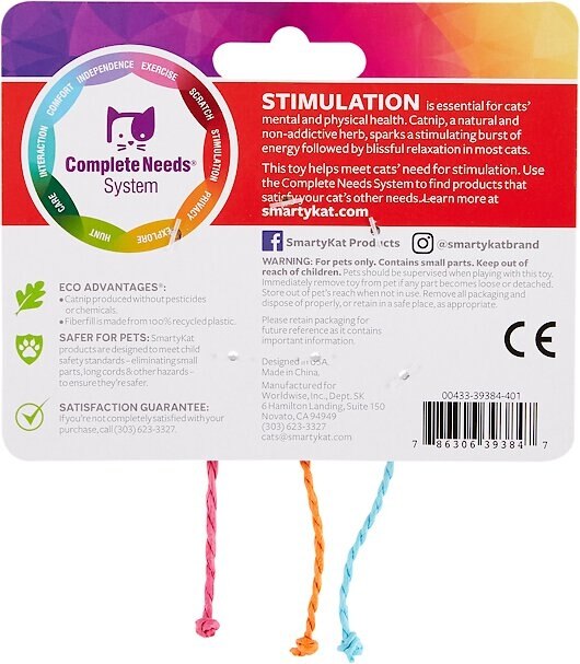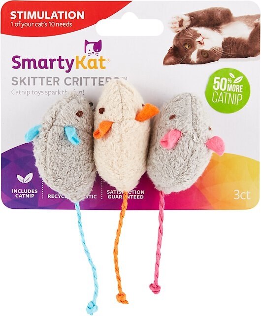 My 3 kitties absolutely love these mouse toys! They play and play with them every day. This will be the third time we have ordered them because they play with them so much and so roughly that they literally beat the stuffing out of them! We have been very pleased with all of the Smartykat brand products we have gotten for them and our fur-babies are extremely happy with them! We love Chewy and how convenient it is to place a order. They have such a large selection of cat products, a lot of them you can't find in stores. The stores all seam to cater to dogs and the cat section hardly exists. We will continue to by from Chewy. Thanks so much !!!!