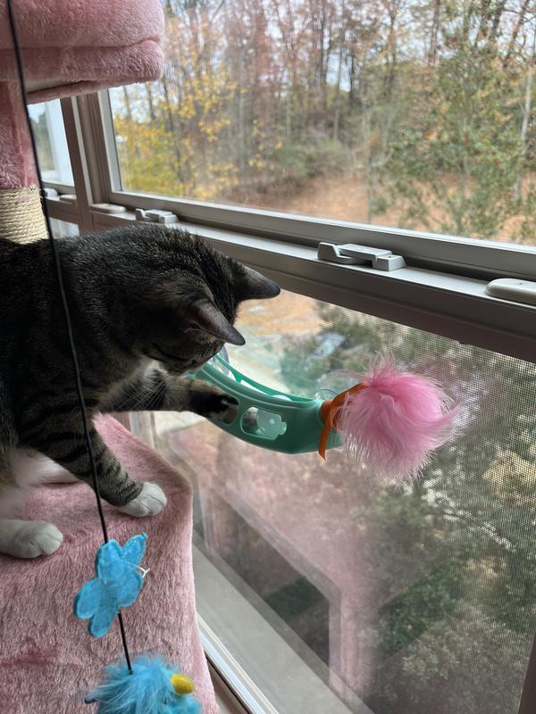 This is a rare find in that the toy actually adheres to the window glass and withstands the cat's play. You may have better luck with this, this did not hold my cats' interest. I still have it hanging up in hopes they will someday start using the toy.