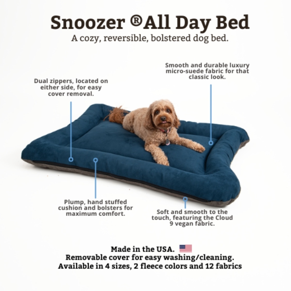 Snoozer Pet Products All Day with Cloud 9 Ash Reversible Microsuede Dog & Cat Bed, Sapphire, Small