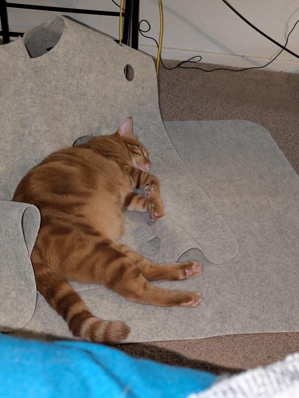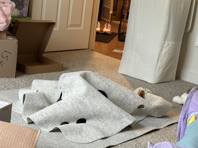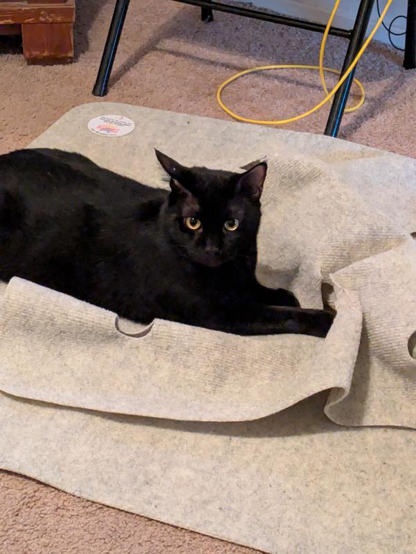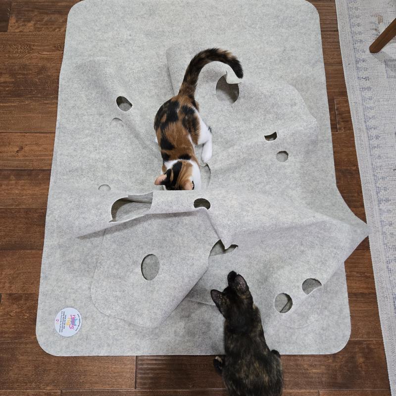 This mat is suitable for cats of all sizes and ages. There are 14 holes ranging from 2 inches to 7 inches. The medium to large holes have expansion slits allowing cats to pass through or pop their heads out. The small holes are meant for paws to poke through.The safety slits can be elongated about an additional inch, making them 2 inches long total.The holes can be made larger or even interconnected if need be.