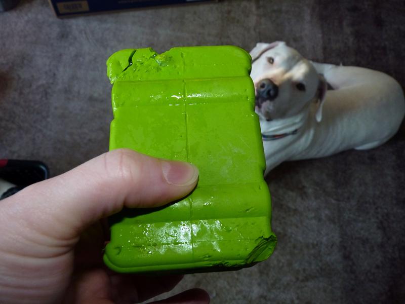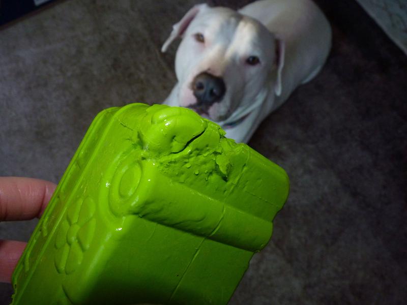 My new dog has destroyed a LOT of toys. "Indestructible", "invincible", you name the brand, she's probably shredded it. VERY few things have lasted more than 20-30 minutes. This one claims to be "tough" and "perfect for power chewers". NOPE. You could see small pieces being scraped off before she even got the treats out of it, and it didn't take 20 minutes before she was getting big pieces off of the corners. In the garbage it went. If you *don't* have a super chewer, the corners and angles of this would make it more interesting for the dog to have to get peanut butter or treat paste out of, and it would bounce unpredictably for playing fetch. Some of the toys that have outlasted my insane chewer so far are the large Kong Extreme Ball, Goodie Ribbon, and Dental Chew, Frisco snowman and pumpkin rubber treat dispensers, large WoofBite ball, and large West Paw Jive ball. If you have a very destructive dog, try one of them instead. Not recommended for strong chewers.