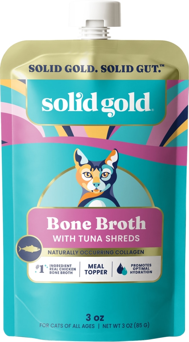- Solid Gold Bone Broth Chicken Shreds Grain-Free Wet Cat Food Topper, 3-oz pouch, case of 12$27.48 Chewy Price$26.11 Autoship PricePromo, New Customers Only: Spend $49+, Get $20 eGift Card