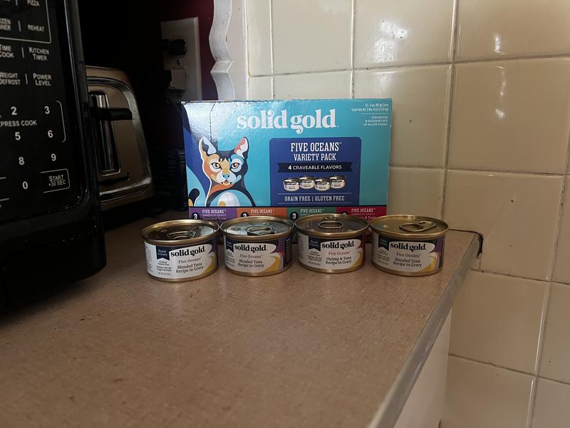 - DealSolid Gold Five Oceans Shreds with Real Tuna Recipe in Gravy Grain-Free Canned Cat Food, 6-oz, case of 8$21.44 Chewy Price$22.32 List Price$20.37 Autoship PricePromo, Spend $100, Get $30 eGift Card with code NEWYEAR +1 deal