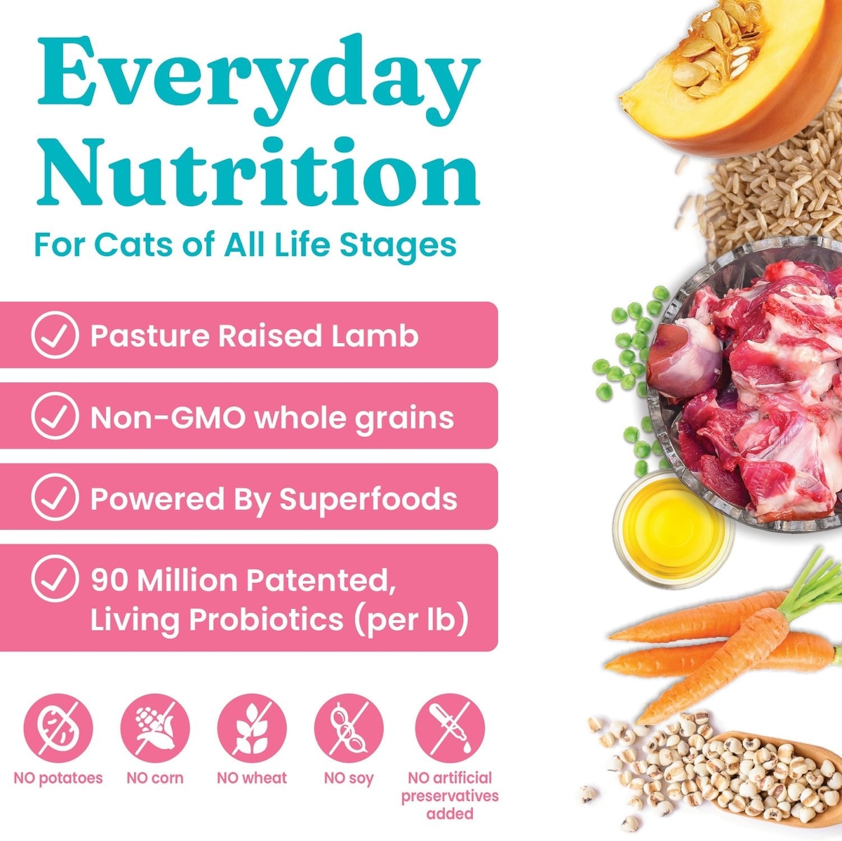Made with real meat, superfoods, and essential nutrients to fuel your thriving pet. Absolutely free of corn or soy, these recipes keep it real.