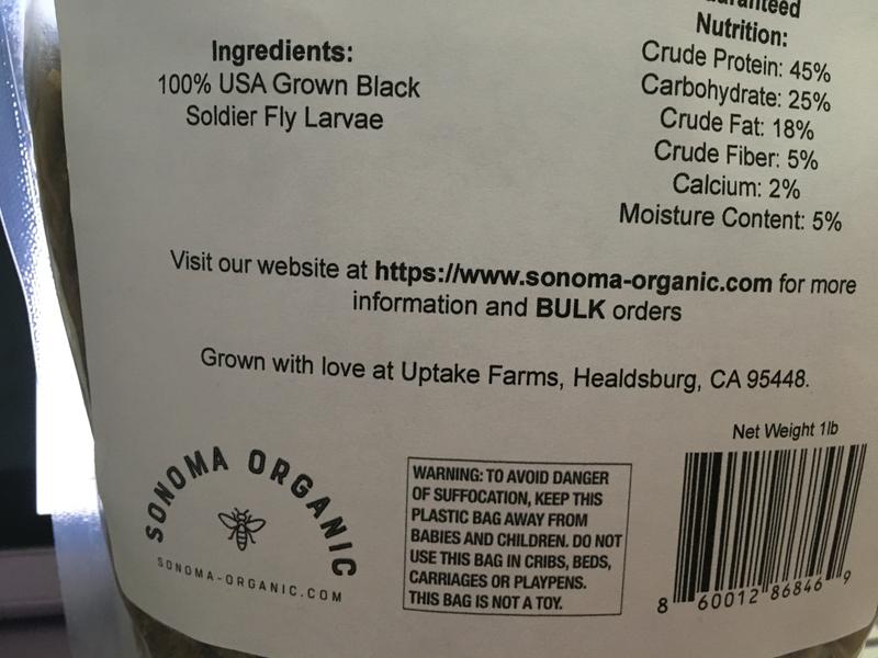 I have only one elderly hen left at the moment . She is 7 1/2 years old ! At her age , and since she just moulted, she is not laying eggs, but I do want her to have a little more weight with winter coming and these Sonoma Organic pretium dried black soldier fly larvae are a perfect snack for her . The nutritional values in this product keep me assured that she is getting plenty of extra protein ,carbs, crude fats, fiber and calcium. This product came well packaged in a resealable bag. There are a pound of the soldier fly larvae and these will last a long while . So a value for the money . Even if one has a small flock , this would be an economical product to feed as a healthy snack . My old girl loves this product and gobbles them down clucking happily! I am happy that these flies are sourced in a way that is earth friendly ! I am also happy that these can be fed as a snack to my two red ear slider turtles ! They also love them! I’m very happy with this product . These are grown in California , responsably sourced , and are organic. But most of all im happy to have a healthy snack to feed my old hen. Her feathers looks amazing , She has gained a bit of weight, she is active ,healthy and happy . I would very much recommend this product !