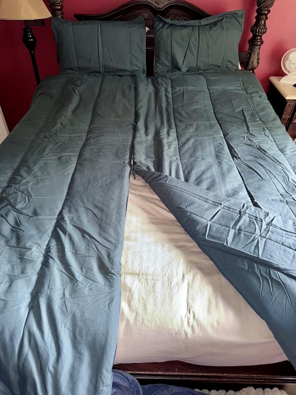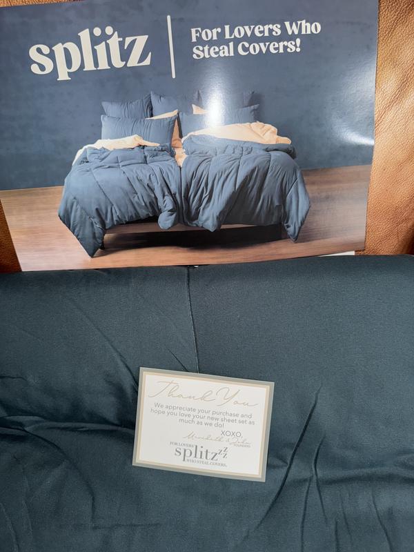 I have never seen a comforter designed quite like this. I have seen the Scandinavian style of using separate duvets, but not the concept of having "hidden" ties that provide the option of combining them into one, with the flexibility of leaving part of it open. I really like the ability to have the bed made in a traditional way, but having the functionality of having it divided as well. One thing I especially love - and I can't stress this enough-is the width of the comforter! It is so nice to have a comforter that actually covers both sides of the mattress! Of course, that also allows plenty of width when divided, as well. As far as quality, the comforter and shams are well-made and the fabric is velvety soft. I believe it will wear well over time, even after machine washing. As for the color, the Watercolor is very much true to the pics in the listing. The only two things that I found to be potential drawbacks. I feel like you really need to have the Splitz sheet set if you like to use a top sheet; otherwise, you kind of lose the full benefit of the design. I'm also not sure how much stress the ties will be able to handle after many uses; however, they may be perfectly fine, and will never be a problem, so that doesn’t affect my rating at all. Overall, this is a neat idea that I’m hoping will give us more space to stretch out, and still let our dog sleep on the bed!