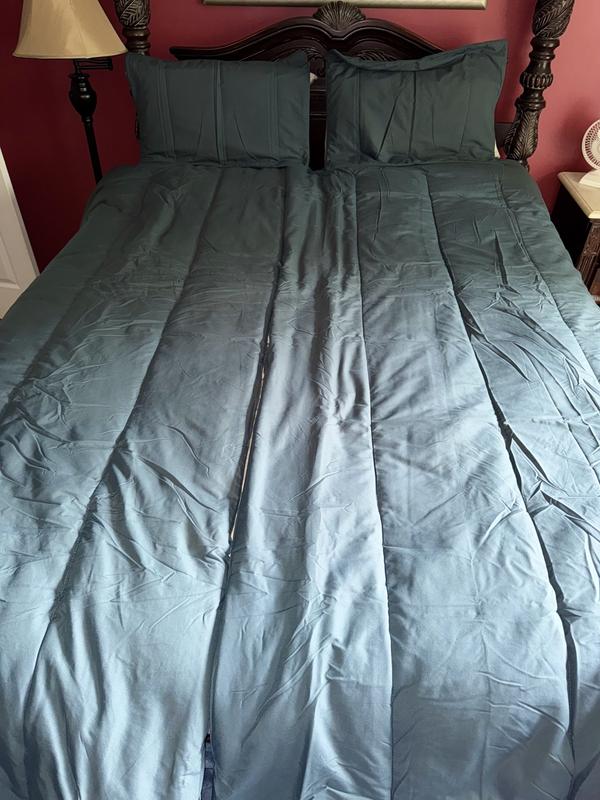 - Innovative split design functions like separate comforters but maintains a seamless look on your bed.