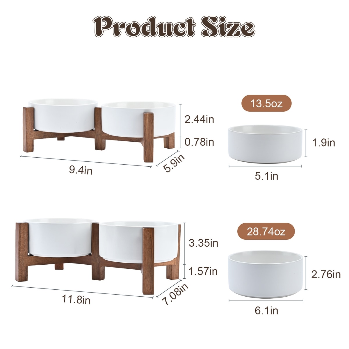 SpunkyJunky Ceramic & Acacia Wood Raised Dog Bowls, 2 count, White, 3.6 cup