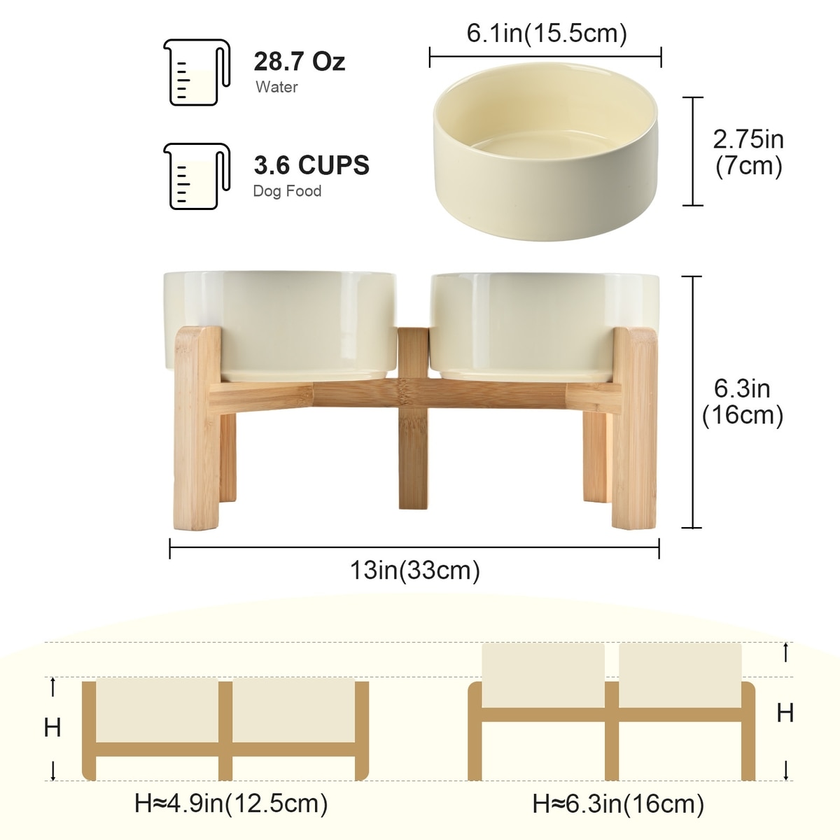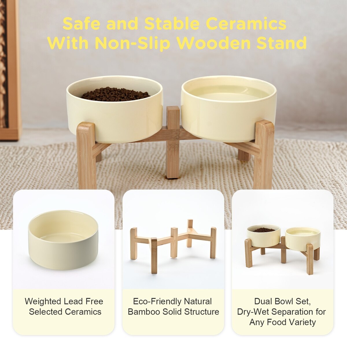 SpunkyJunky Ceramic & Bamboo Non-Slip Elevated Dog Bowls, 2 count, Beige, 3.6 cup