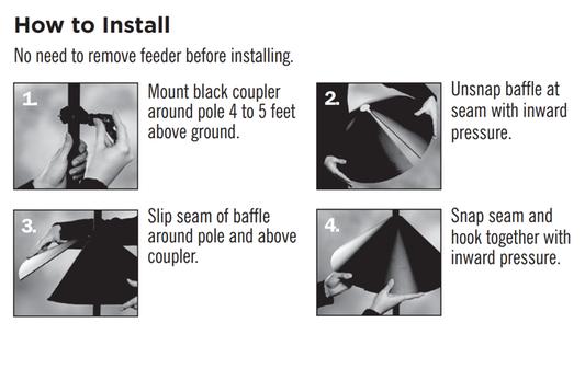 The Squirrel-X squirrel guard installs easily to bird feeder poles and shepherd hooks measuring 0.5 inches-1.25 inches in diameter.