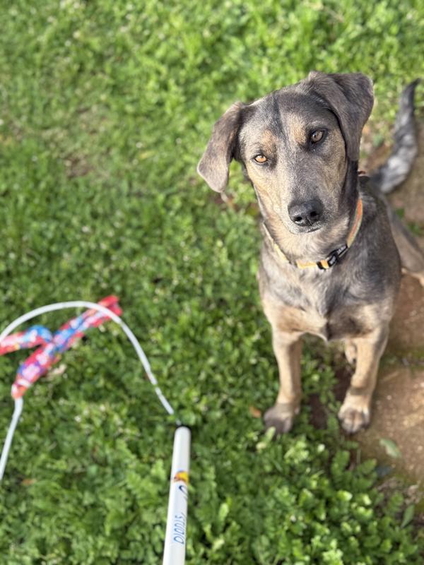 Squishy Face Studio Flirt Pole V2 with Lure Squeaky Dog Toy, Rainbow Tie Dye, Regular