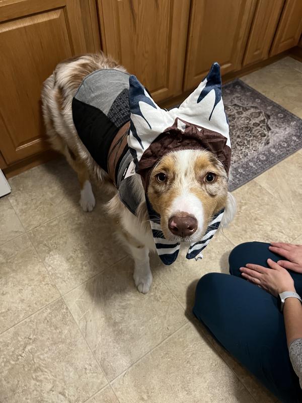LOVE this! Ahsoka is a favorite character in our household, so we are thrilled to see more of these items popping up. The size medium fits and looks great on our 15lb miniature poodle. We even made her two little Ahsoka saber hilts out of foam to go with it, and attached them to the sides with velcro!
