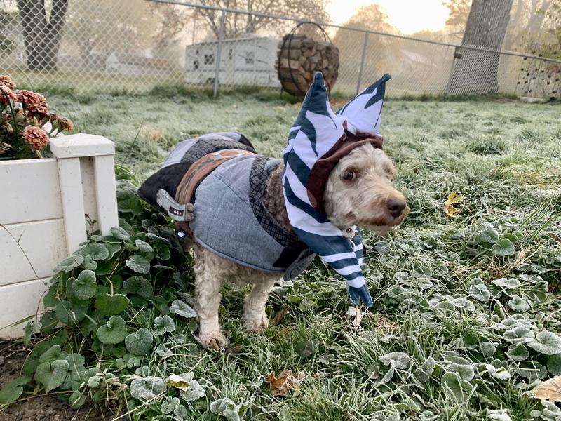 No Jedi-mind-tricks here. This one is all treat. This costume gets an A++. Not only does it fit the "long and low" perfectly but it is really comfortable and well made. It even has a fleece lining. Zane has actually worn it, sans headpiece, on his walks. It doubles as a great light jacket and he loves it! Hope there are more of these to come!