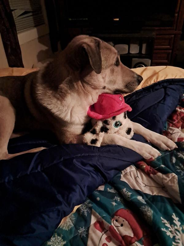 What a super fun oversized stuffed dog toy! Was an instant Favorite under the Christmas tree! Surprised at how big it is so much fun! Very durable and love the crinkles!