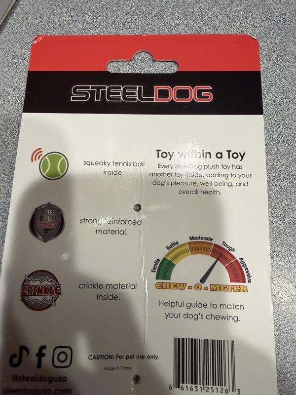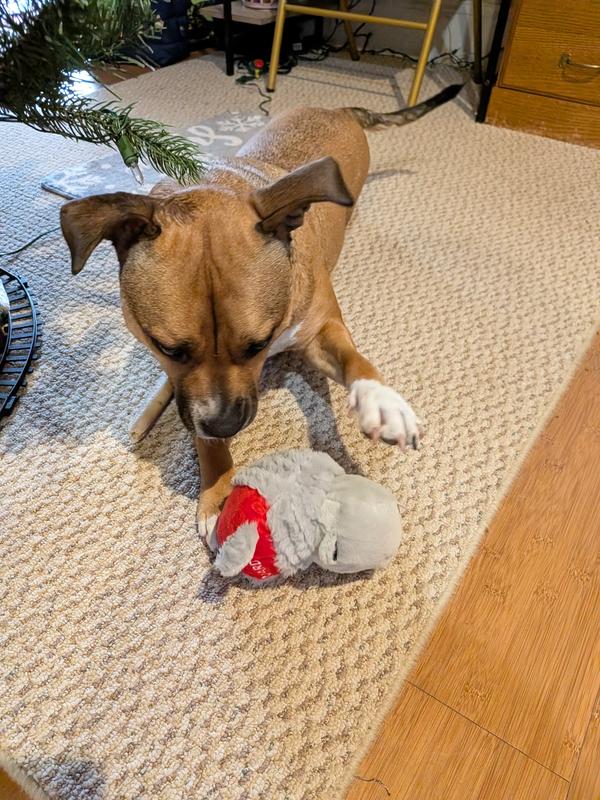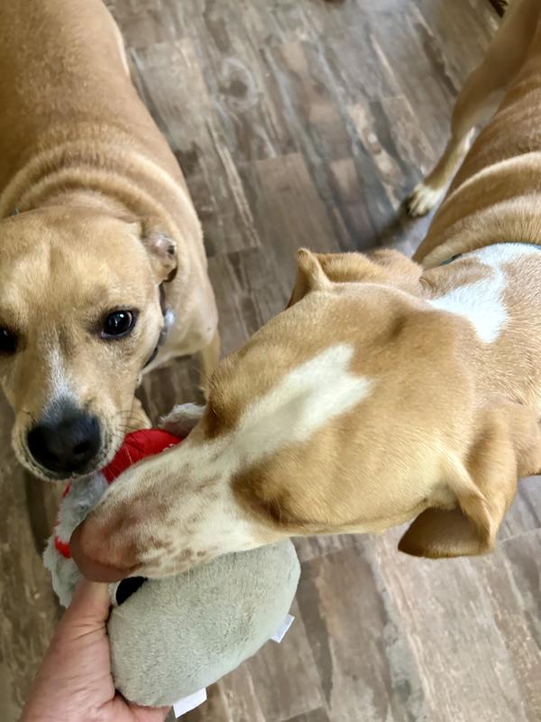 This toy is cute but bigger than I expected. It also has a ball inside. That’s probably my fault for not reading the description thoroughly. My dogs still enjoy it (two small dogs and one big dog) but not as much as I had hoped. I think if the ball inside was softer, they would like it more.