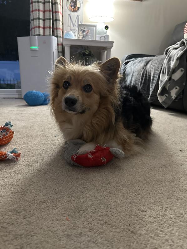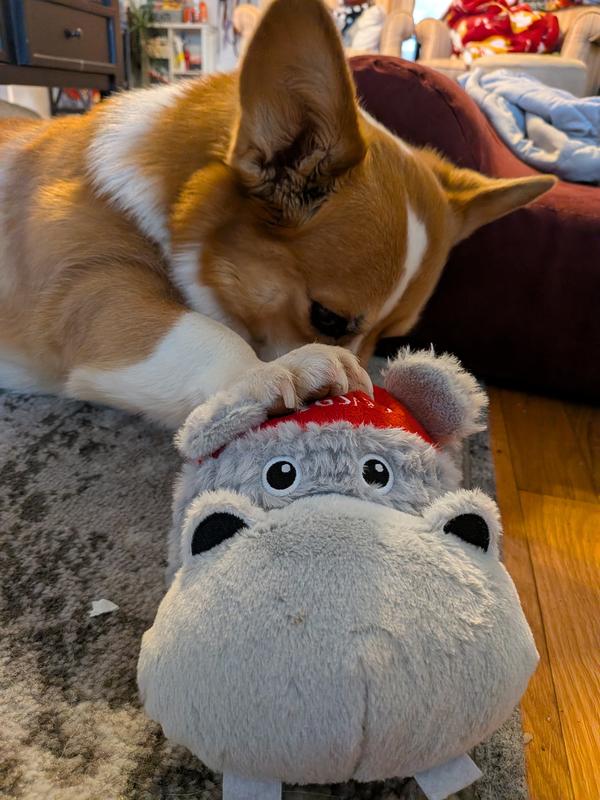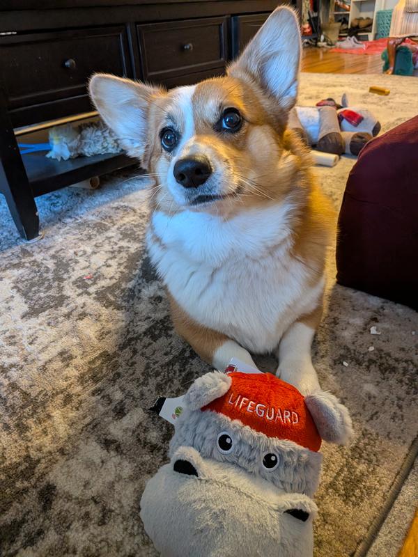 Lifeguard Hippo is so cute and has several smaller grab areas with the ears, nose, and teeth so all size dogs can drag it around. Daisy the corgi liked it immediately