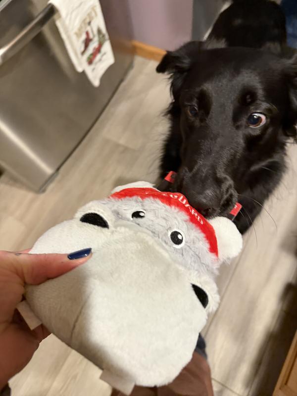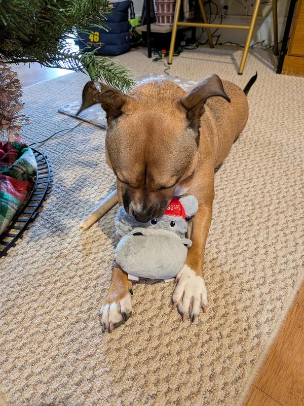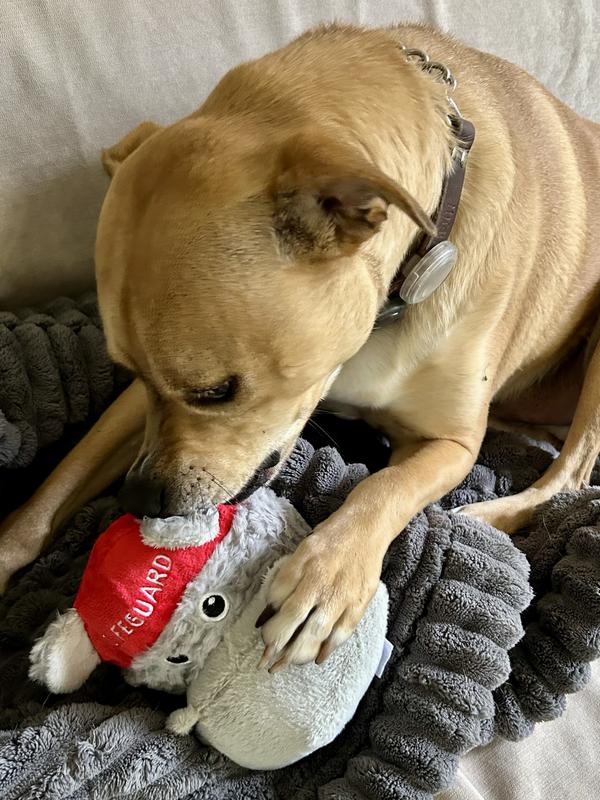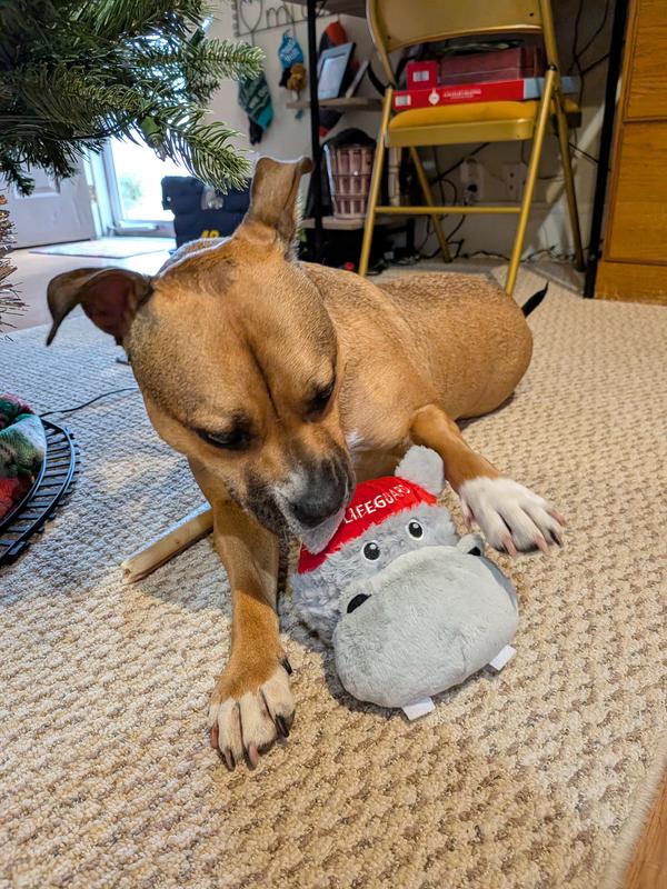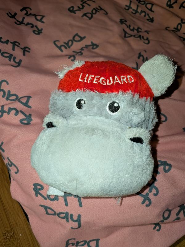 Lifeguard Hippo is so cute and has several smaller grab areas with the ears, nose, and teeth so all size dogs can drag it around. Daisy the corgi liked it immediately and she said we able to carry it off into the next room with no issues. The hippo has 2 types of soft texture to it. The ears crinkle and there is a solid tennis ball hidden inside. The material in general feels fairly sturdy and up to some rough play.
