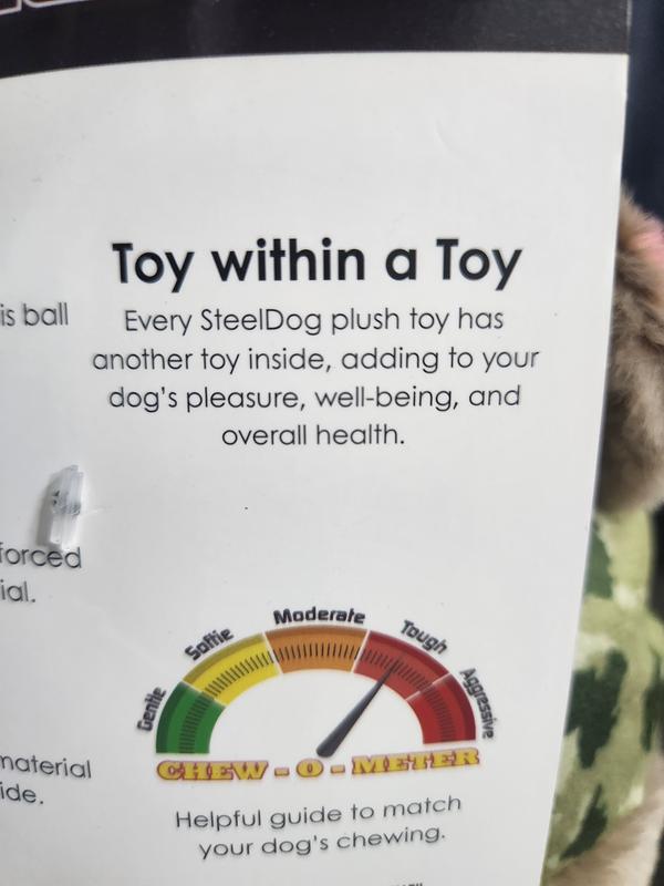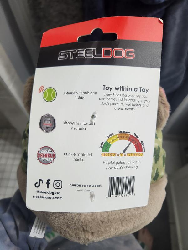 My Boston Terrier was very excited about this toy! It’s definitely well made and sturdy. Giving this toy 4 stars because the description says the soldier toy crinkles, but only the ears contain a crinkle material. Also, can’t seem to get the inner tennis ball to squeak. My dog doesn’t seem to mind and couldn’t wait to play with this plush toy. Should also mention the brand is SteelDog USA but the toy is made in China.