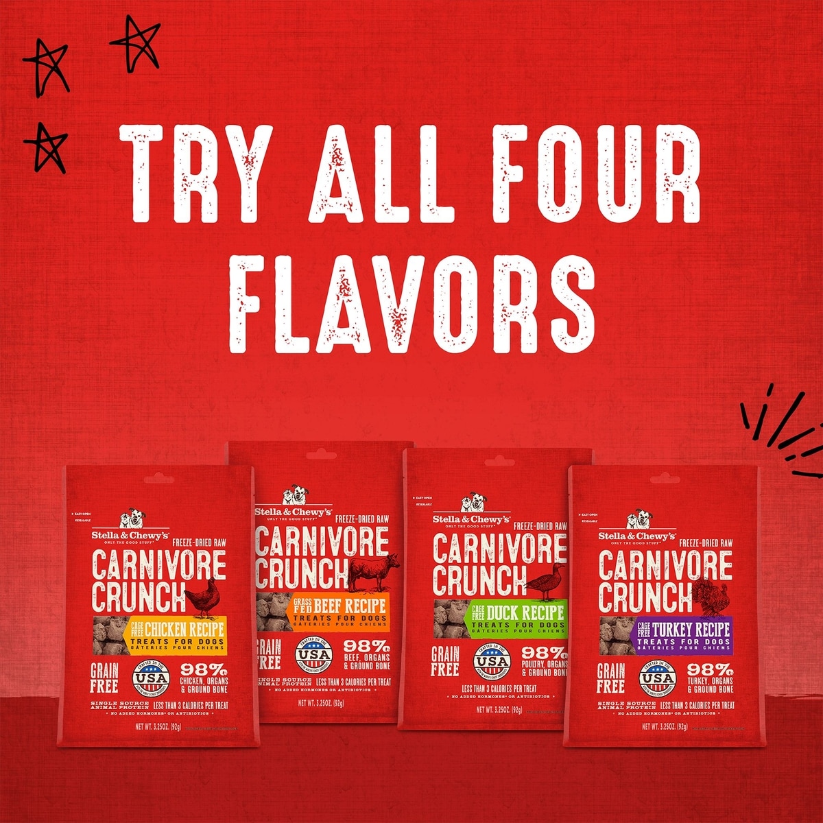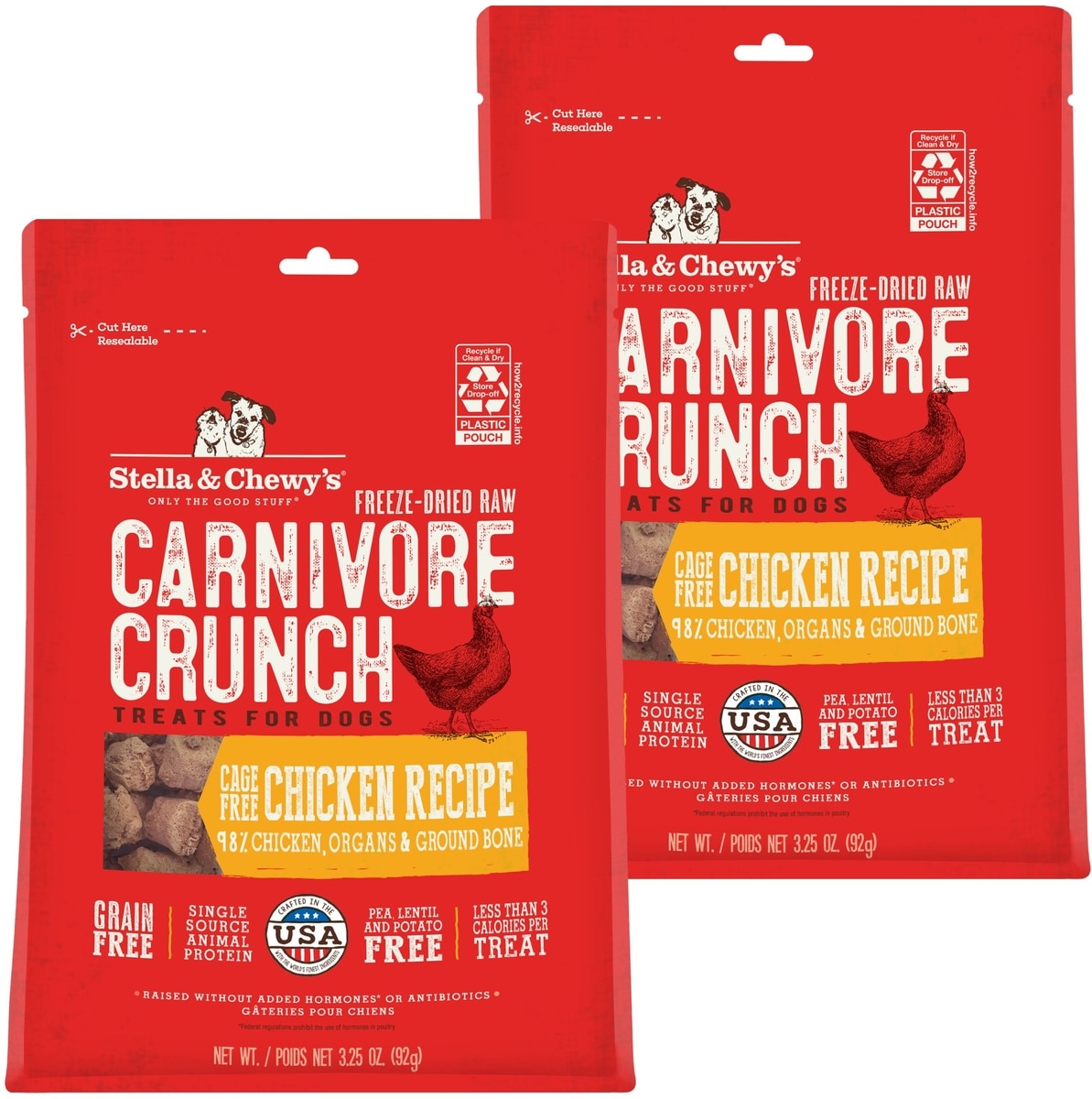- Stella & Chewy's Carnivore Crunch Cage-Free Duck Recipe Freeze-Dried Raw Dog Treats, 3.25-oz bag$14.99 Chewy Price$14.24 Autoship PricePromo, New Customers Only: Spend $49+, Get $20 eGift Card +1 deal