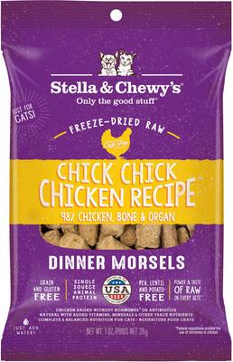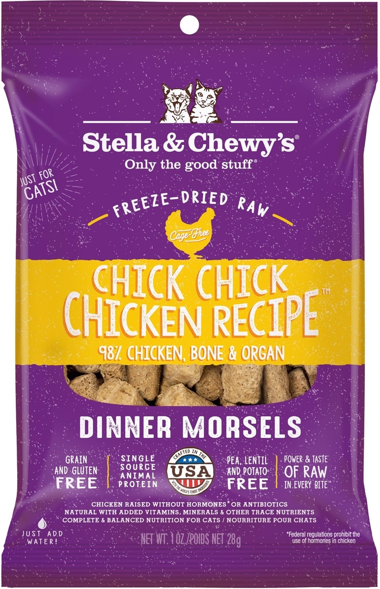 - Stella & Chewy's Yummy Lickin' Salmon & Chicken Dinner Morsels Freeze-Dried Raw Cat Food, 1-oz bag$2.49 Chewy Price$2.37 Autoship PricePromo, New Customers Only: Spend $49+, Get $20 eGift Card