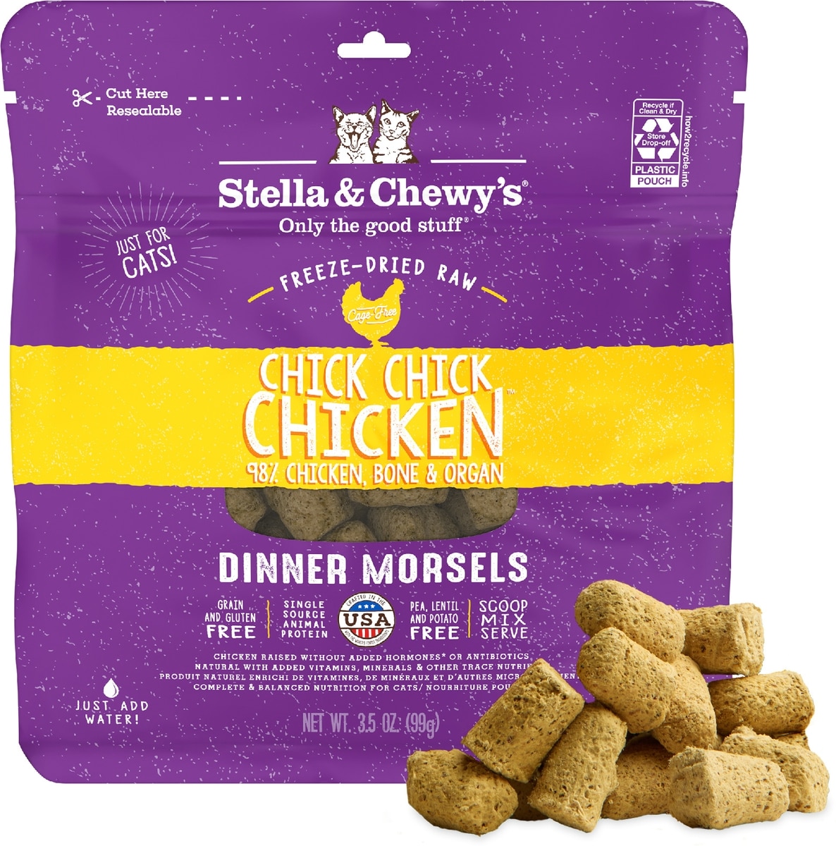 - Stella & Chewy's Yummy Lickin' Salmon & Chicken Dinner Morsels Freeze-Dried Raw Cat Food, 3.5-oz bag$10.99 Chewy Price$10.44 Autoship PricePromo, New Customers Only: Spend $49+, Get $20 eGift Card