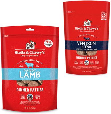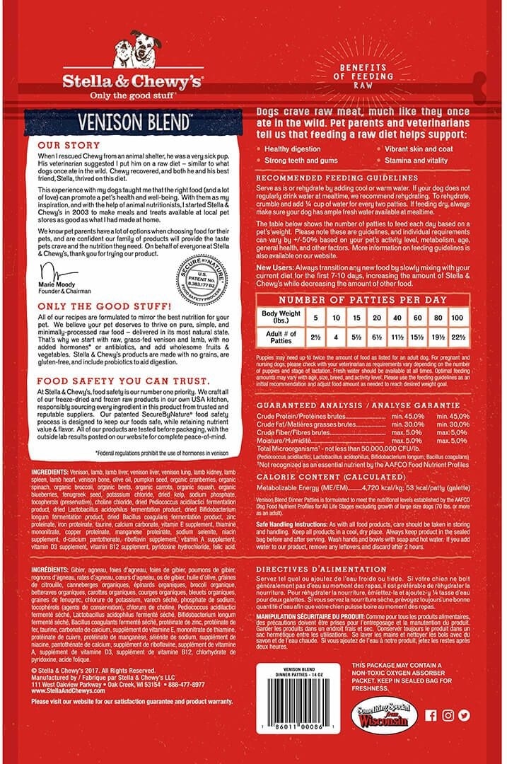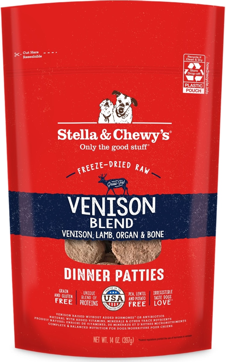 Stella & Chewy's Venison Blend Dinner Patties Freeze-Dried Raw Dog Food, 14-oz bag—Give your dog what he naturally craves with Stella & Chewy's Venison Blend Dinner Patties Freeze-Dried Raw Dog Food. Based on the philosophy that dogs thrive on the same diet they would eat in the wild, this all-natural recipe makes it easy to feed your best friend only the good stuff. Made from sustainably-sourced ingredients and raw protein, this recipe starts with 95% grass-fed venison and lamb, organs, and bone, plus 100% certified-organic fruits and vegetables—offering the benefits of raw food nutrition with the convenience of freeze-dried preparation. And to ensure the highest quality, each batch is made with care in Stella & Chewy’s own U.S. kitchen.