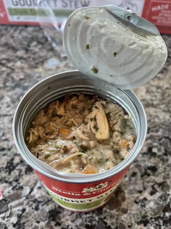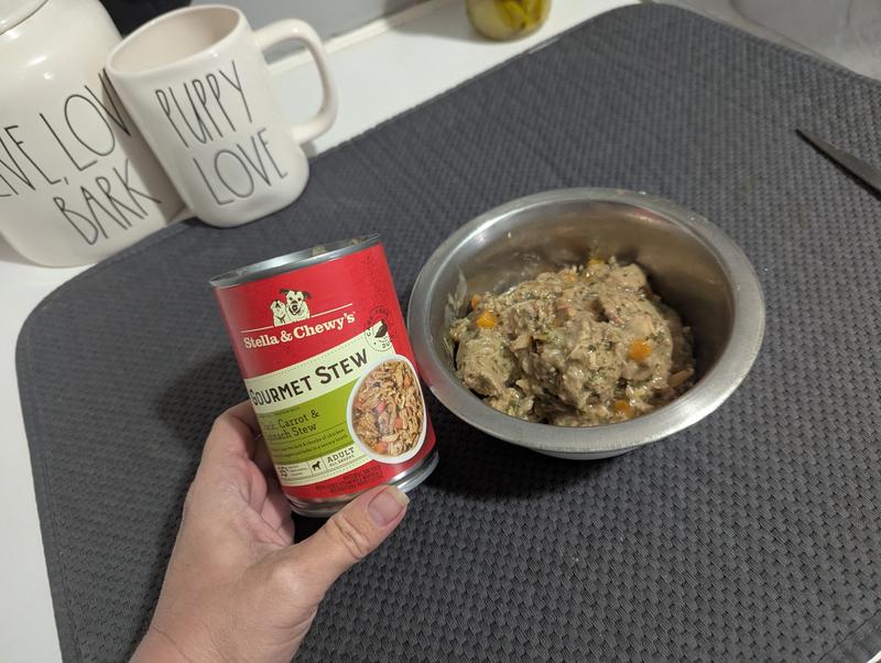Our 21 month old,14lb, Pug Gunni must have loved the Stella & Chewy's Gourmet Stew Cage-Free Duck because she didn't hesitate at all to start eating it. We always use canned food as a mix-in to her dry food for her evening meals and she gobbled it up right away. It actually looked very appetizing with the meat shredded and not too much gravy.