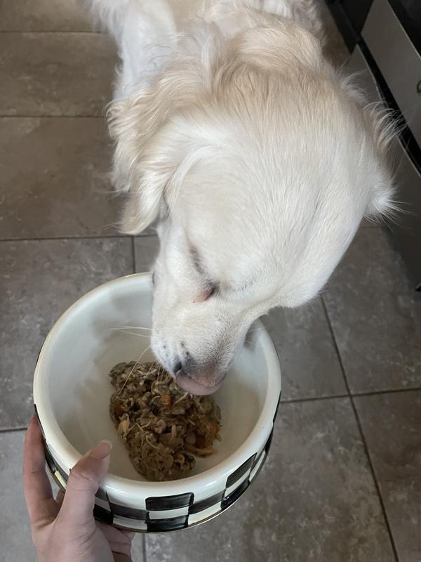 Gave this to my two pups at home as a snack just to try it out. They loved it, and I love that it is made without by-product meals, artificial colors, flavors or preservatives. Really trying to be more aware of what I am giving to my pets. I also love that it looks like real food- I can see the chunks of meat and veggies. Would definitely buy this for them as a staple and feel good about them eating it.