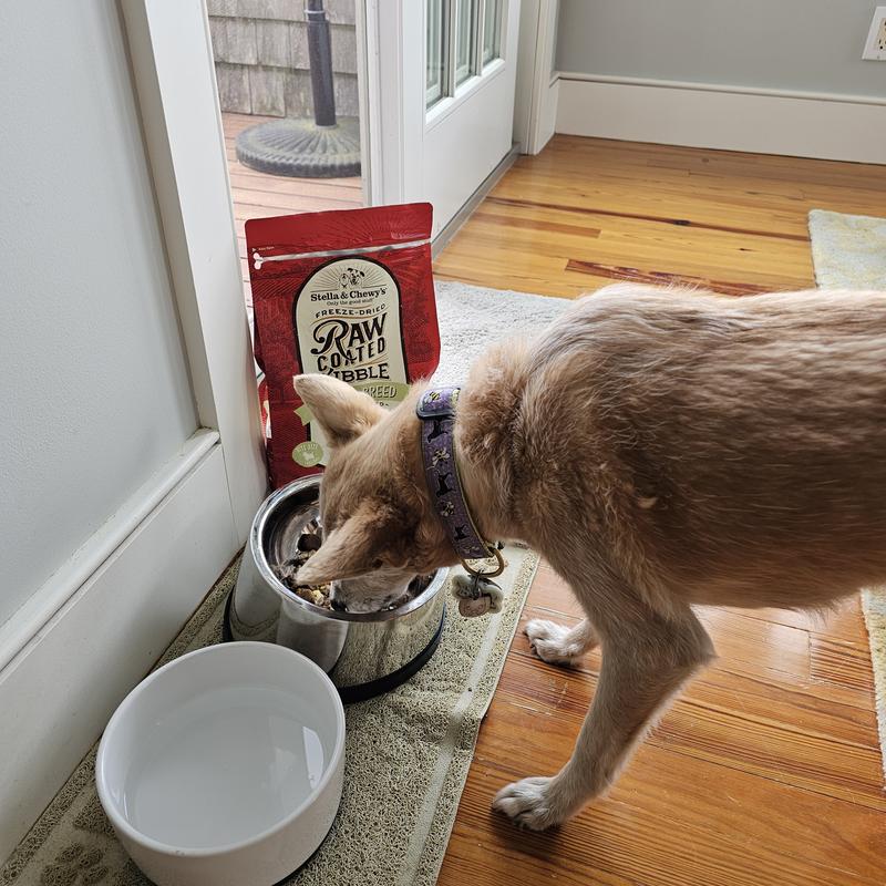 I’m a huge fan of Stella and Chewy products so I’m grateful for the opportunity to review this food. My boys eat a fresh food diet, sometimes raw, and I’ve had my boys eat the raw freeze dried patties from S&C, which they also love. I have one who is a very picky eater and absolutely hates kibble, but he really liked this one! The smell was enticing enough that they were begging for some as soon as the bag opened up. I decided to give them the raw coated kibble as a treat, in their eneichnent toys, they worked hard to get every bite. I’m a big fan of S&C not only because my dogs go crazy for it, but the ingredients are great, even in this kibble. I highly recommend.