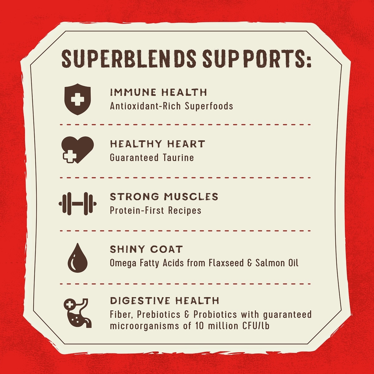 • All SuperBlends recipes feature meats, poultry and fish raised without added hormones or antibiotics—they also include wholesome grains like oatmeal and quinoa plus a plethora of superfoods to provide your dog with a range of vitamins and nutrients.