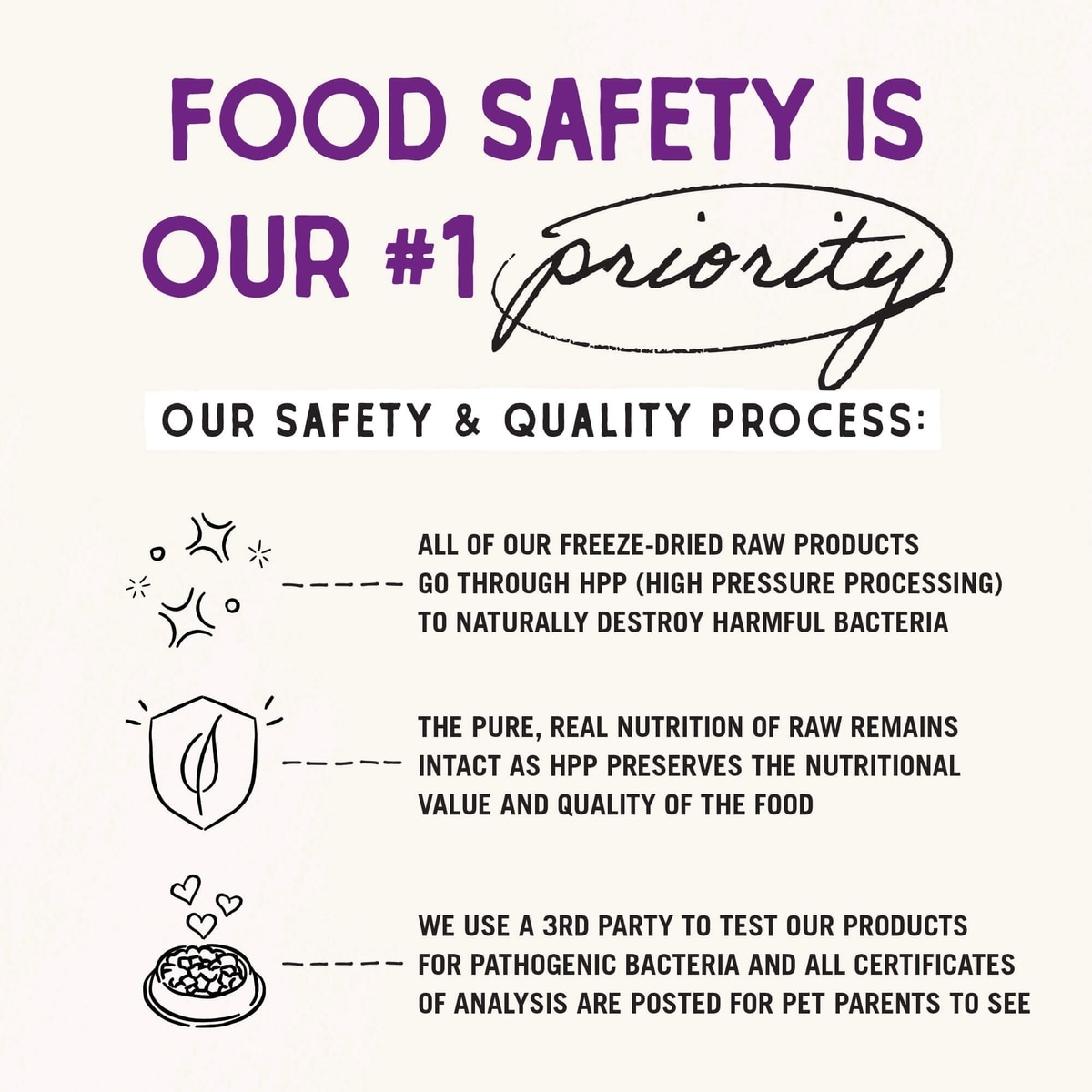 Every batch of Stella & Chewy’s Freeze-Dried Cat Morsels meets our strict food safety standards through a multi-layered approach that includes High-Pressure Processing (HPP)—an advanced cold-pressure safety step that helps reduce harmful pathogens while preserving the food’s natural nutrition and raw integrity—along with independent third-party lab testing for safety and nutrient accuracy, and rigorous supplier standards with full ingredient traceability, helping ensure consistent quality and confidence in every bite.