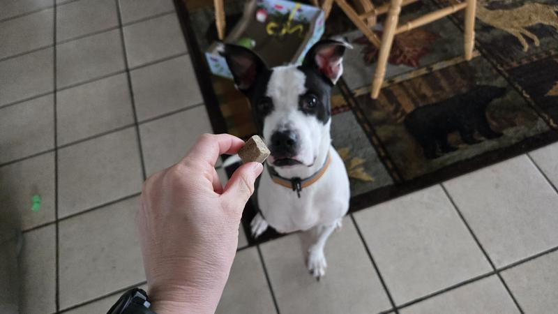 My sweet puppy, Finnegan, is not the most food centered dog. So when we went to the vet and he literally yelled at the vet to give him more of these treats, I knew I had to get him a container of his own! The biggest downside is finding a spot to hide them in my apartment because Finn will constantly berate me to spoil him with these delicious treats! 5 out of 5 paws for sure!