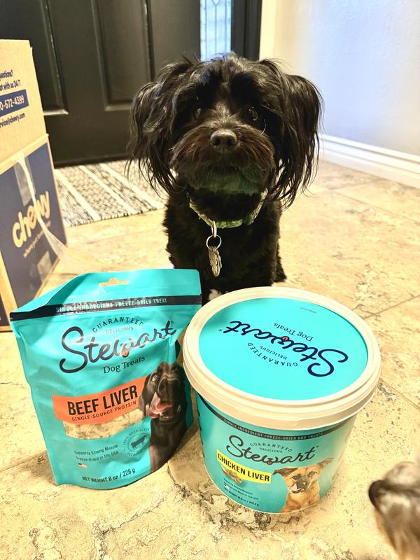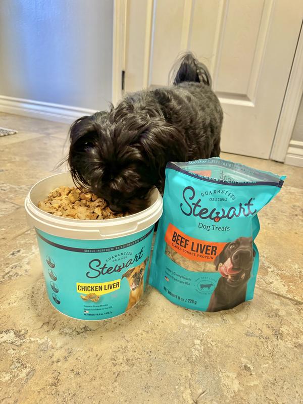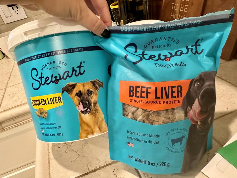 Stewart Chicken Liver Freeze-Dried Raw Dog Treats, 16.8-oz tub—A healthy dog is a happy dog, and a happy you! Stewart Freeze-Dried Chicken Liver Dog Treats are made with one simple ingredient—100% chicken liver. Stewart's single-ingredient treats are Grain-Free, gluten free, and never enhanced with artificial flavoring or fillers like corn and soy, meaning you’ll be feeding your best friend the prime quality they deserve. These natural dog treats are great for training, dog enrichment toys, play time, or rewarding a job well done. Packaged in a resealable tub to keep them fresh, these yummy dog treats are also perfect to put inside fun puppy chew toys for teething or dog toys for aggressive chewers (sold separately). Stewart Freeze-Dried Dog Treat morsels are also the perfect dog food toppers to add when you reach the end of the tub, meaning these treats are multiuse and great for more than training your pets. These delicious treats are lightweight and easy to store with a long shelf life, made in the USA, and crafted with care in small batches to ensure the highest quality. Stewart's single ingredient dog snacks are designed for dogs of all sizes and ages. Choose Stewart—because it’s real food, and nothing else. Stewart Beef Liver Freeze-Dried Dog Treats, 8-oz pouch—A healthy dog is a happy dog, and a happy you! Stewart Freeze-Dried Beef Liver Dog Treats are made with one simple ingredient: 100% beef liver. Stewart’s single-ingredient treats are Grain-Free, gluten free, and never enhanced with artificial flavoring or fillers like corn and soy, meaning you’ll be feeding your best friend the prime quality they deserve. These natural dog treats are great for training, dog enrichment toys, play time, or rewarding a job well done. Packaged in a resealable pouch to keep them fresh, these yummy dog treats are also perfect to put inside fun puppy chew toys for teething or dog toys for aggressive chewers. Stewart Freeze-Dried Dog Treat morsels are also the perfect dog food toppers to add when you reach the end of the pouch, meaning our treats are multiuse and great for more than training your pets. These delicious treats are lightweight and easy to store with a long shelf life, made and sourced in the USA, and crafted with care in small batches to ensure the highest quality. Stewart’s single-ingredient dog snacks are designed for dogs of all sizes and ages – we love them all! Choose Stewart – because it’s real food, and nothing else.