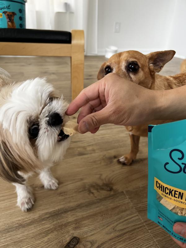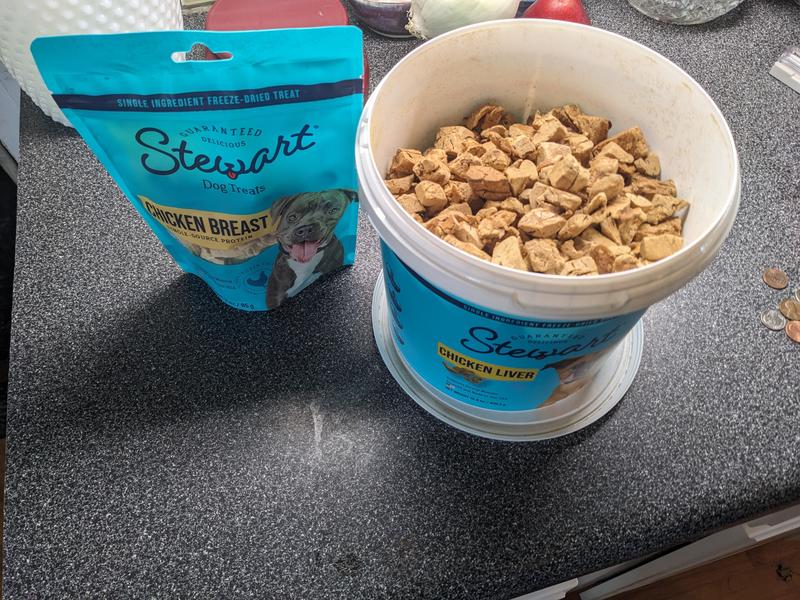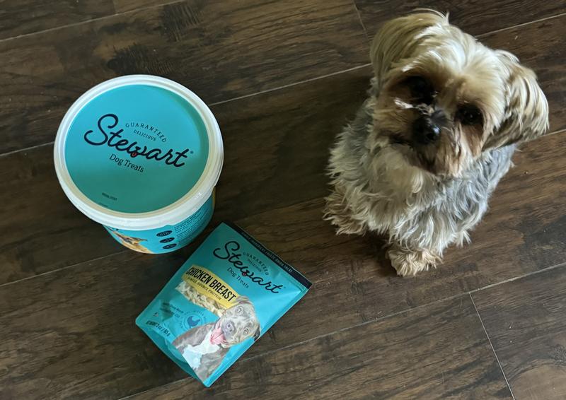 Stewart Chicken Liver Freeze-Dried Raw Dog Treats, 16.8-oz tub—A healthy dog is a happy dog, and a happy you! Stewart Freeze-Dried Chicken Liver Dog Treats are made with one simple ingredient—100% chicken liver. Stewart’s single-ingredient treats are Grain-Free, gluten free, and never enhanced with artificial flavoring or fillers like corn and soy, meaning you’ll be feeding your best friend the prime quality they deserve. These natural dog treats are great for training, dog enrichment toys, play time, or rewarding a job well done. Packaged in a resealable tub to keep them fresh, these yummy dog treats are also perfect to put inside fun puppy chew toys for teething or dog toys for aggressive chewers (sold separately). Stewart Freeze-Dried Dog Treat morsels are also the perfect dog food toppers to add when you reach the end of the tub, meaning these treats are multiuse and great for more than training your pets. These delicious treats are lightweight and easy to store with a long shelf life, made in the USA, and crafted with care in small batches to ensure the highest quality. Stewart’s single-ingredient dog snacks are designed for dogs of all sizes and ages. Choose Stewart—because it’s real food, and nothing else. Stewart Chicken Breast Freeze-Dried Dog Treats, 3-oz pouch—A healthy dog is a happy dog, and a happy you! Stewart Freeze-Dried Chicken Breast Dog Treats are made with one simple ingredient—100% chicken breast. Stewart’s single-ingredient treats are Grain-Free, gluten free, and never enhanced with artificial flavoring or fillers like corn and soy, meaning you’ll be feeding your best friend the prime quality they deserve. These natural dog treats are great for training, dog enrichment toys, play time, or rewarding a job well done. Packaged in a resealable pouch to keep them fresh, these yummy dog treats are also perfect to put inside fun puppy chew toys for teething or dog toys for aggressive chewers (sold separately). Stewart Freeze-Dried Dog Treat morsels are also the perfect dog food toppers to add when you reach the end of the pouch, meaning these treats are multiuse and great for more than training your pets. These delicious treats are lightweight and easy to store with a long shelf life, made in the USA, and crafted with care in small batches to ensure the highest quality. Stewart’s single-ingredient dog snacks are designed for dogs of all sizes and ages. Choose Stewart—because it’s real food, and nothing else.