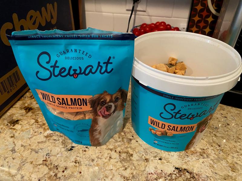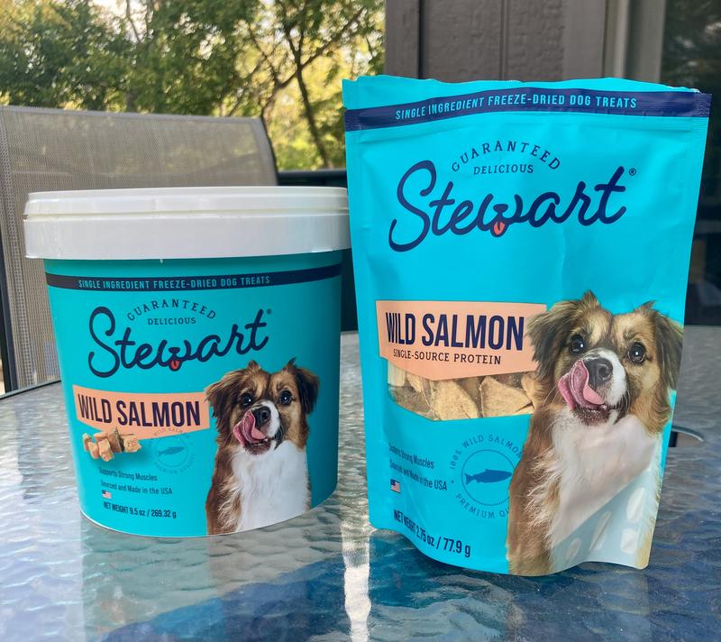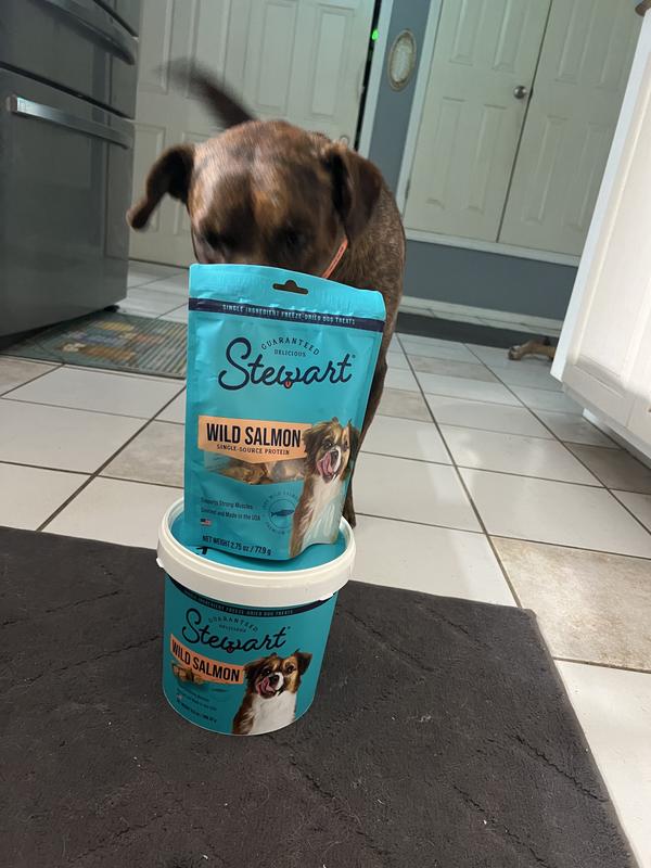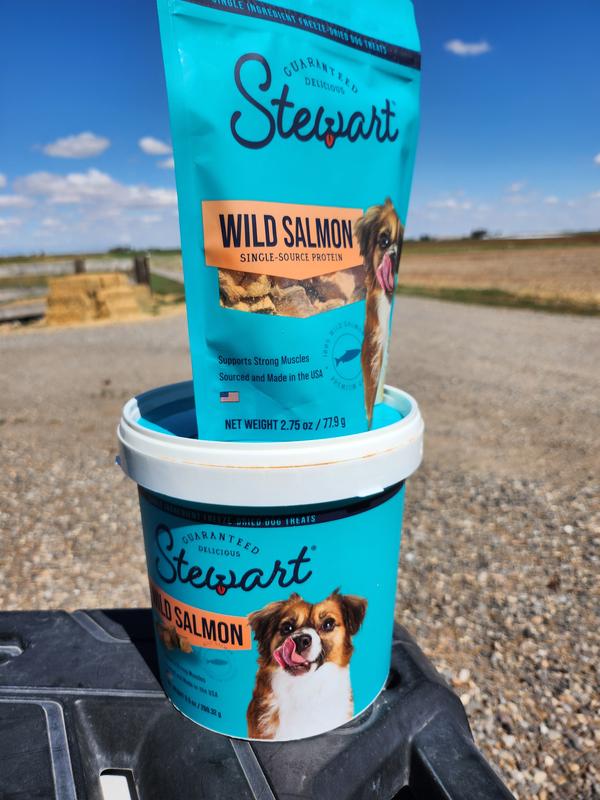 Stewart Wild Salmon Freeze-Dried Dog Treats, 9.5-oz tub—A healthy dog is a happy dog, and a happy you! Stewart Freeze-Dried Wild Salmon Dog Treats are made with one simple ingredient—100% wild salmon. Stewart’s single-ingredient treats are Grain-Free, gluten free, and never enhanced with artificial flavoring or fillers like corn and soy, meaning you’ll be feeding your best friend the prime quality they deserve. These natural dog treats are great for training, dog enrichment toys, play time, or rewarding a job well done. Packaged in a resealable tub to keep them fresh, these yummy dog treats are also perfect to put inside fun puppy chew toys for teething or dog toys for aggressive chewers (sold separately). Stewart Freeze-Dried Dog Treat morsels are also the perfect dog food toppers to add when you reach the end of the tub, meaning these treats are multiuse and great for more than training your pets. These delicious treats are lightweight and easy to store with a long shelf life, made in the USA, and crafted with care in small batches to ensure the highest quality. Stewart’s single ingredient dog snacks are designed for dogs of all sizes and ages. Choose Stewart—because it’s real food, and nothing else. Stewart Wild Salmon Freeze-Dried Dog Treats, 2.75-oz pouch—A healthy dog is a happy dog, and a happy you! Stewart Freeze-Dried Wild Salmon Dog Treats are made with one simple ingredient—100% wild salmon. Stewart’s single-ingredient treats are Grain-Free, gluten free, and never enhanced with artificial flavoring or fillers like corn and soy, meaning you’ll be feeding your best friend the prime quality they deserve. These natural dog treats are great for training, dog enrichment toys, play time, or rewarding a job well done. Packaged in a resealable pouch to keep them fresh, these yummy dog treats are also perfect to put inside fun puppy chew toys for teething or dog toys for aggressive chewers (sold separately). Stewart Freeze-Dried Dog Treat morsels are also the perfect dog food toppers to add when you reach the end of the pouch, meaning these treats are multiuse and great for more than training your pets. These delicious treats are lightweight and easy to store with a long shelf life, made in the USA, and crafted with care in small batches to ensure the highest quality. Stewart’s single ingredient dog snacks are designed for dogs of all sizes and ages. Choose Stewart—because it’s real food, and nothing else.