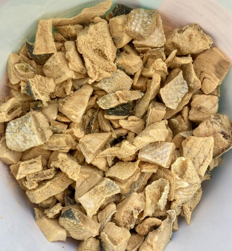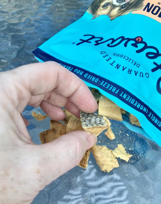 This is the first time I have ever tried feeding my four dogs freeze dried treats and they LOVED these. We got the salmon which is already a heavy favorite in my house and my dogs really enjoy it. The pieces are good sized and look like salmon. I thought freeze dried treats would look weird but you can tell it’s just fish. The smell isn’t overpowering and they are solid enough to use as treats but also easy to manage for my large breed dog missing some teeth. All my dogs are 50+ pounds and I thought the size of the pieces was good for them. Will be adding these to part of our treat rotation.