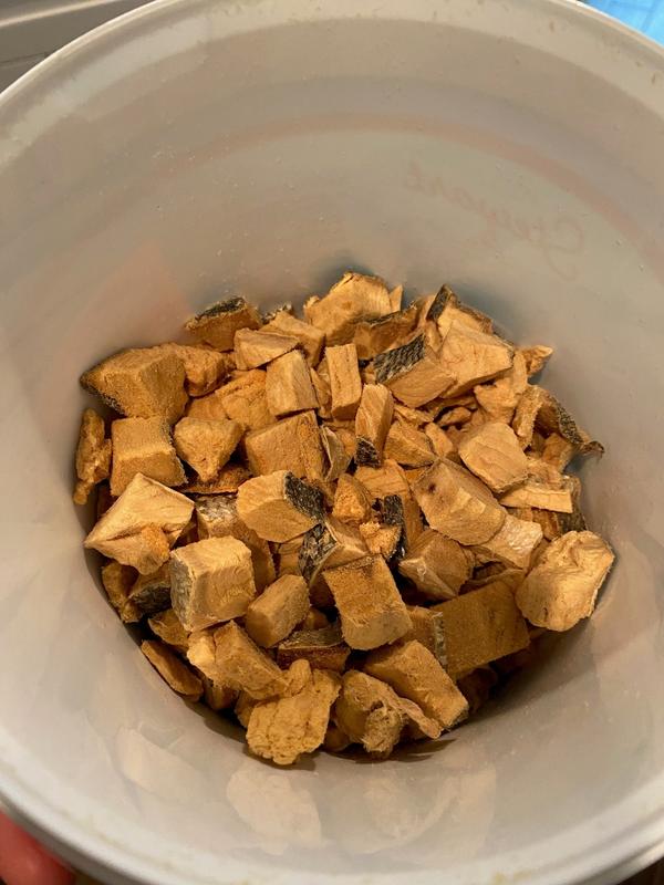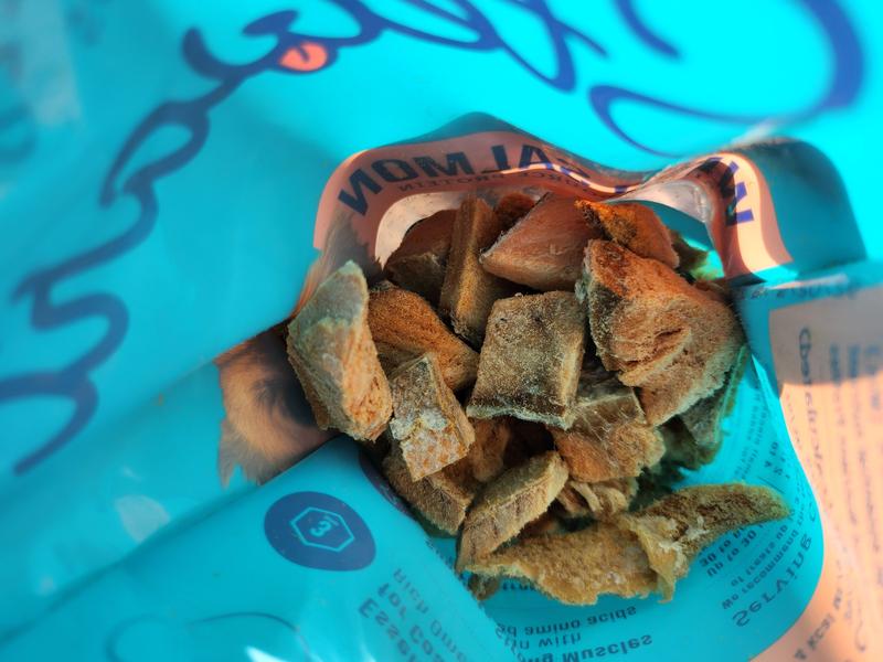 This product is very simply just freeze-dried salmon bite-size pieces, but apparently there's some extra love and magic in there to make it very appealing for even the most discerning of palates. My three bigger dogs absolutely love these nibbles, and a fourth little guy who is a very picky eater went ham on these treats. Even my cat, who is a very choice eater, snuck in and snatched a bite from the tub before I could stop him. The treats are labeled specifically for dogs, but seem like they would be appealing for cats as well. In the smaller bag and the larger tub that I received, the pieces were mostly "larger", in that a small dog could potentially have some issues eating them. Since they are freeze-dried, they can be broken apart, but it's a somewhat messy endeavor. It would probably work well to break up larger chunks and crumble them over regular food to catch all the goodness. They do have a powerful fishy odor, which is probably a good part of the appeal to dogs, which is either a blessing or a curse to people, depending on how much they enjoy that smell. It seems to be well-contained within the packaging, however.