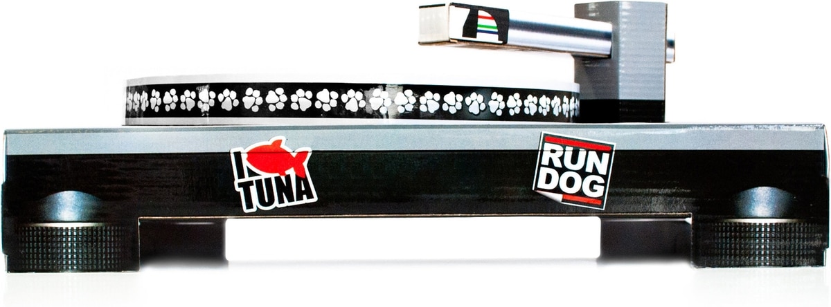 Very cute, but the turntable sits on a small piece of dowel. My cat puts his paws underneath it looking for something and knocks it off. Poor design. I will probably end up just setting the scratch pad on the floor or maybe glue it to the record player base.