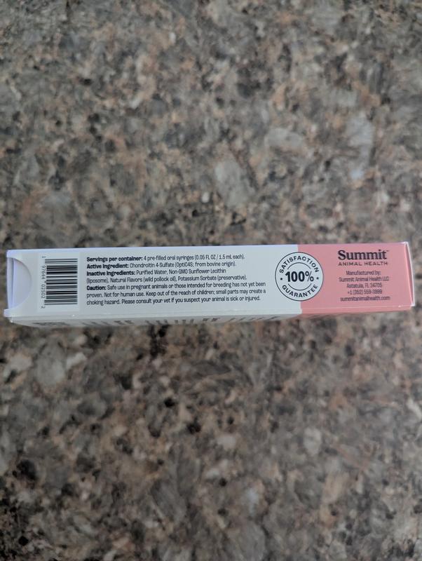 The active ingredients in the formulation are a proprietary blend of Chondroitin 4-Sulfate. The Chondroitin is sourced from bovine cartilage and goes through a unique distillation process providing the purest form of Chondroitin 4 Sulfate (OptiC4S) on the market. Summit Animal Health's products offer maximum absorption with many customers seeing results in their animal within the first 48 hours. The Summit Joint and Mobility products are effective for various types of joint discomfort however, depending on the severity of the joint condition, results may vary.