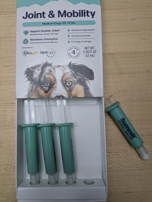 I have a 12-year-old standard poodle that has not been diagnosed but has had some hip discomfort on her left side hasn't been playing as much and has been noticeably stiff when we come home from walks after her nap. I decided to try this on her and within 3 weeks we saw significant difference in her energy level and her ability to get up and down. As of right now we cannot see any lamess or discomfort in her hip. I have used the injectable summit products for My horses before. We had considered that for our older poodle and for my younger border collie that had a bilateral fhos on his hips. We decided against it due to cost and we're looking for other alternatives. They both have been on joint supplements which I think have made a difference but not nearly as much as this seems to. We did get this product for free to try and I've already placed a paid order for three more boxes to start my border Collie and for a month of both of them. They're both be on auto ship. I have tried so many joint products and I can honestly say it this one works very well and is a very budget friendly price point.