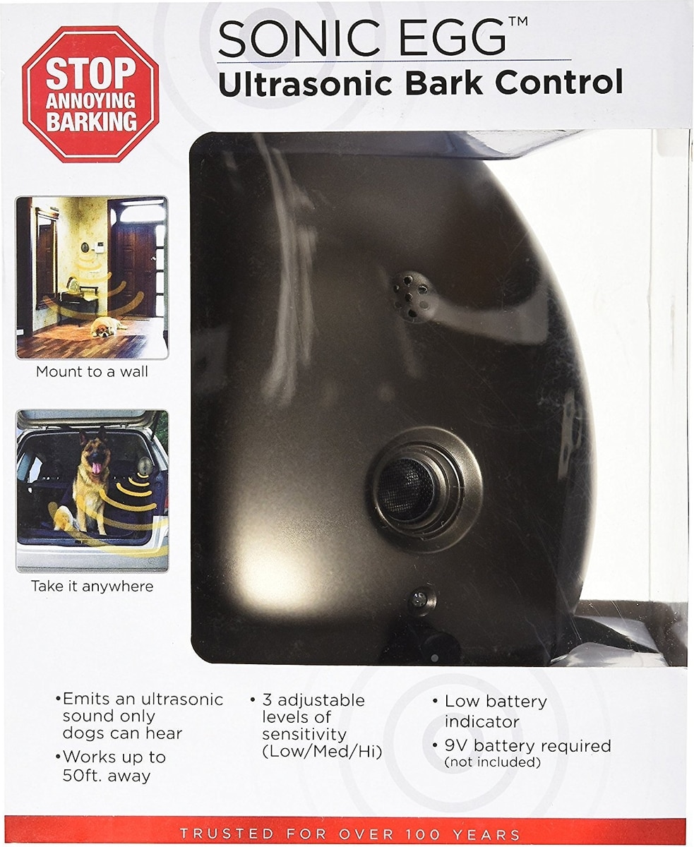 The Sunbeam Sonic Egg Ultrasonic Bark Control Device detects barking up to 50 feet away and will work through a wood fence. It does only work on 85% of dogs because of differences in the hearing ability of dogs, and other factors such as age and temperament, not all dogs will react the same to ultrasonic bark control devices.