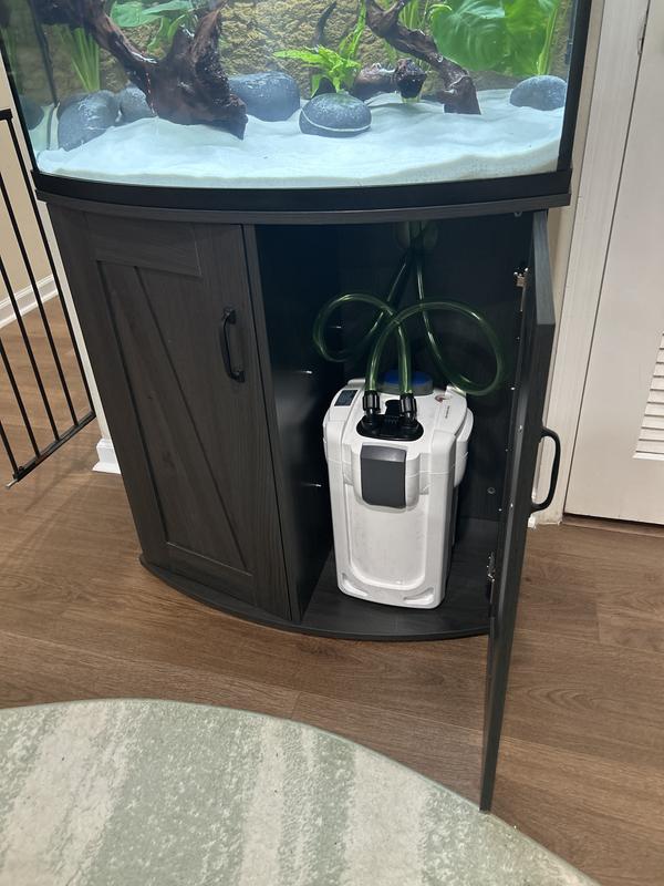 Perfect size to fit under my tank but provides three large compartments to add lots of filter materials. Comes with a good amount of starter media but I did add more ceramic rings and more sponge. Filter is silent, I literally hear nothing. Primed right away with little to no effort. Make sure you fill filter with water first. Don’t love the black spray bar against my beige background but I will paint that with Krylon Fusion to match better. Haven’t tried UV as I am cycling my tank right now. Overall super happy with my purchase. Quality filter.