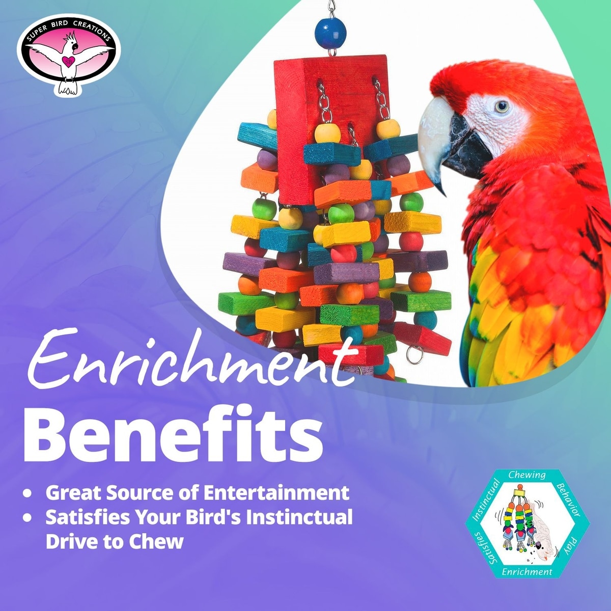 Providing enrichment in the form of purposely designed toys can prevent boredom and reduce behavioral problems in pet birds. These toys encourage healthy, natural instinctual activities, because bird toys are more than mere playthings for your bird!